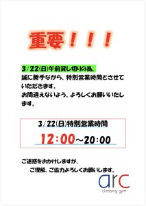 3/22(日)の午前中は施設貸し切りの為、営業時間は12時~20時とさせていただきます。